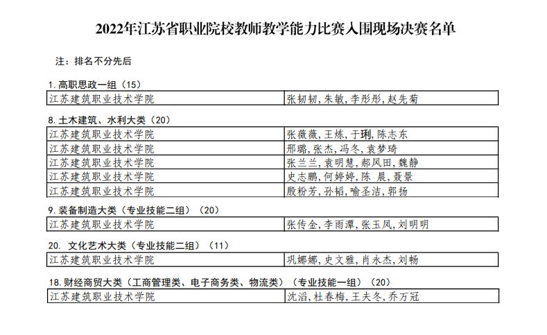 近日,2022年江苏省职业院校教学能力比赛初赛落下帷幕。经评选,我校在高职思政、土木建筑水利大类、装备制造大类(专业技能二组)、财经商贸大类、文化艺术大类(专业技能二组)五个赛项中共有9件作品入围现场决赛,入围总数在全省参赛院校中位列第三,创造了近三年参加江苏省职业院校教学能力比赛初赛的最好成绩。