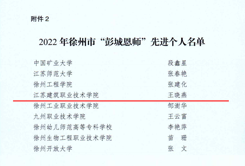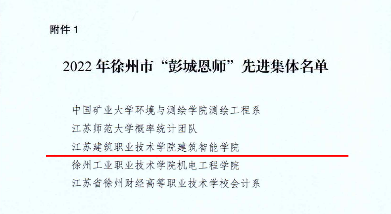 近日,中共徐州市委教育工委、徐州市教育局公布了2022年徐州市“彭城恩师”先进集体和“彭城恩师”先进个人名单,我校建筑智能学院获评徐州市“彭城恩师”先进集体荣誉称号,建筑智能学院教师王晓燕获评徐州市“彭城恩师”先进个人荣誉称号。