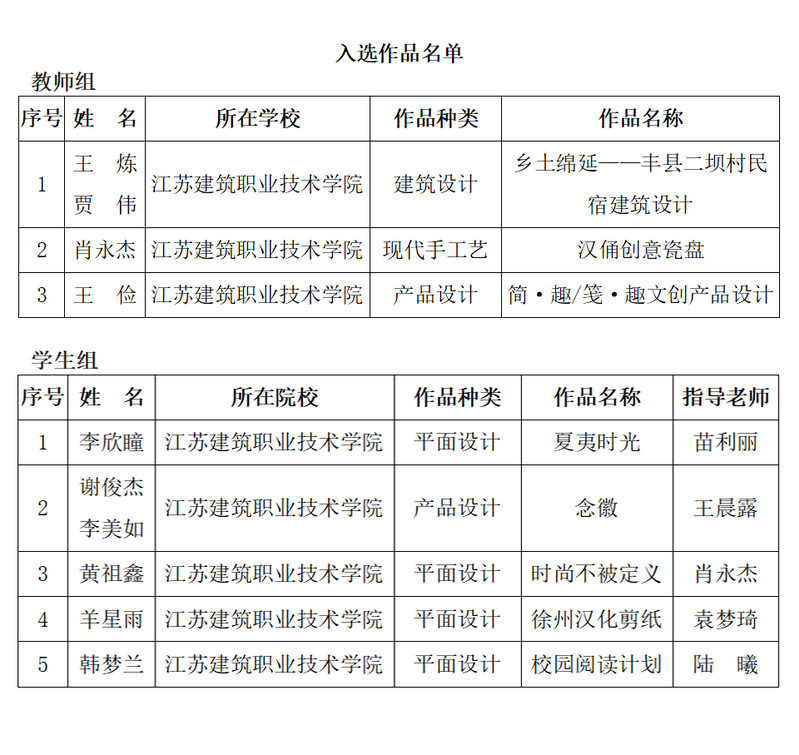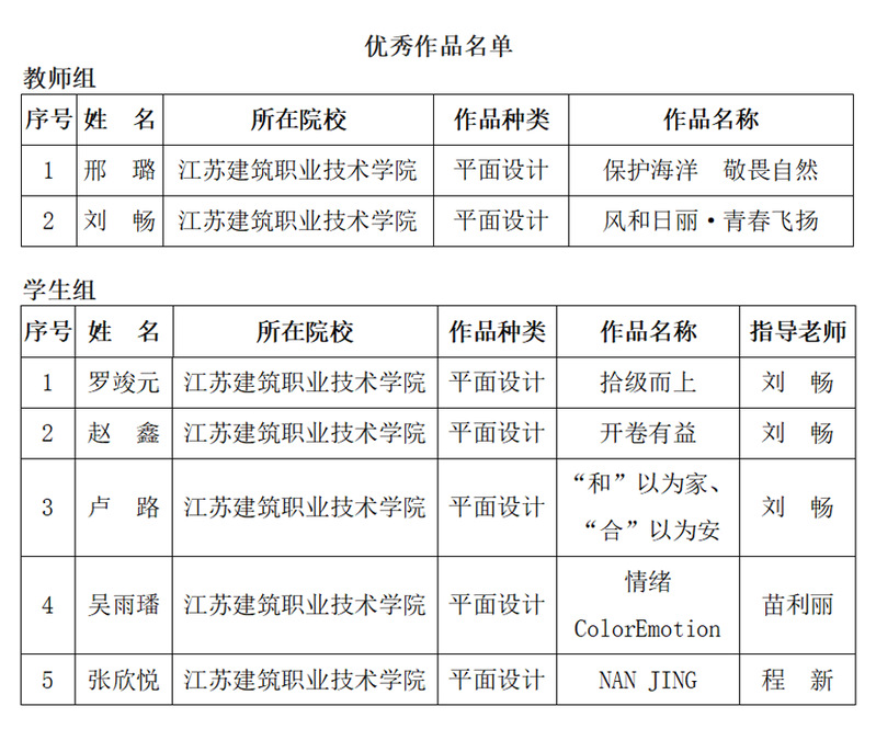 近日,江苏省教育厅公布了“融通并茂——第五届江苏省高校设计作品展”获奖名单。我校获评“优秀组织奖”,8件作品获评“入选作品”(教师组3件、学生组5件),7件作品获评“优秀作品”(教师组2件、学生组5件),成绩相较以往有显著提升。在同类院校中,我校获奖数量、等次均为最高。
