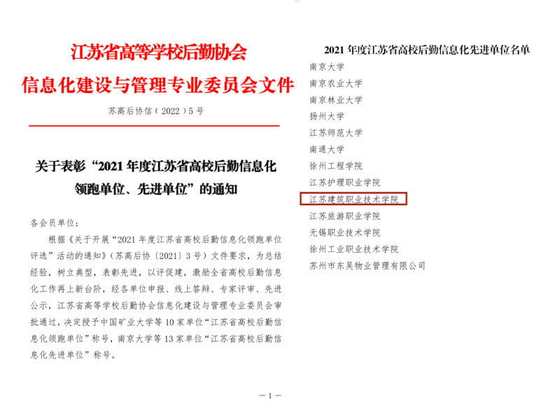 近日,江苏省高等学校后勤协会公布了“2021年度江苏省高校后勤信息化领跑单位、先进单位”评选结果,我校获评“2021年度江苏省高校后勤信息化先进单位”荣誉称号。