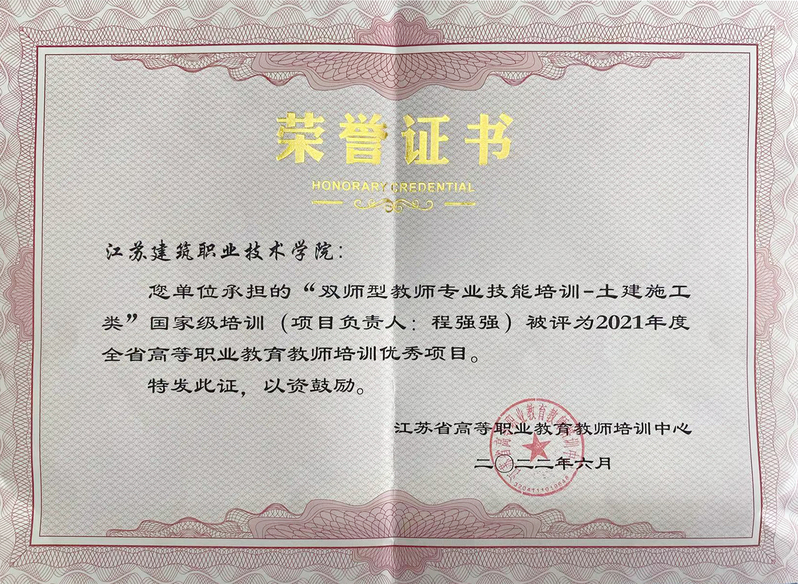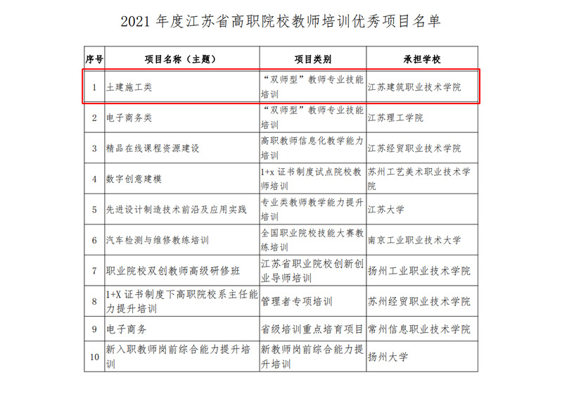 近日,江苏省高等职业教育教师培训中心公布了“2021年度江苏省高职院校教师培训优秀项目名单”,由我校建筑建造学院承办的国家级培训项目“双师型教师专业技能培训-土建施工类”被评为2021年度全国高等职业教育教师培训优秀项目。据悉,全省共评出优秀项目10项。