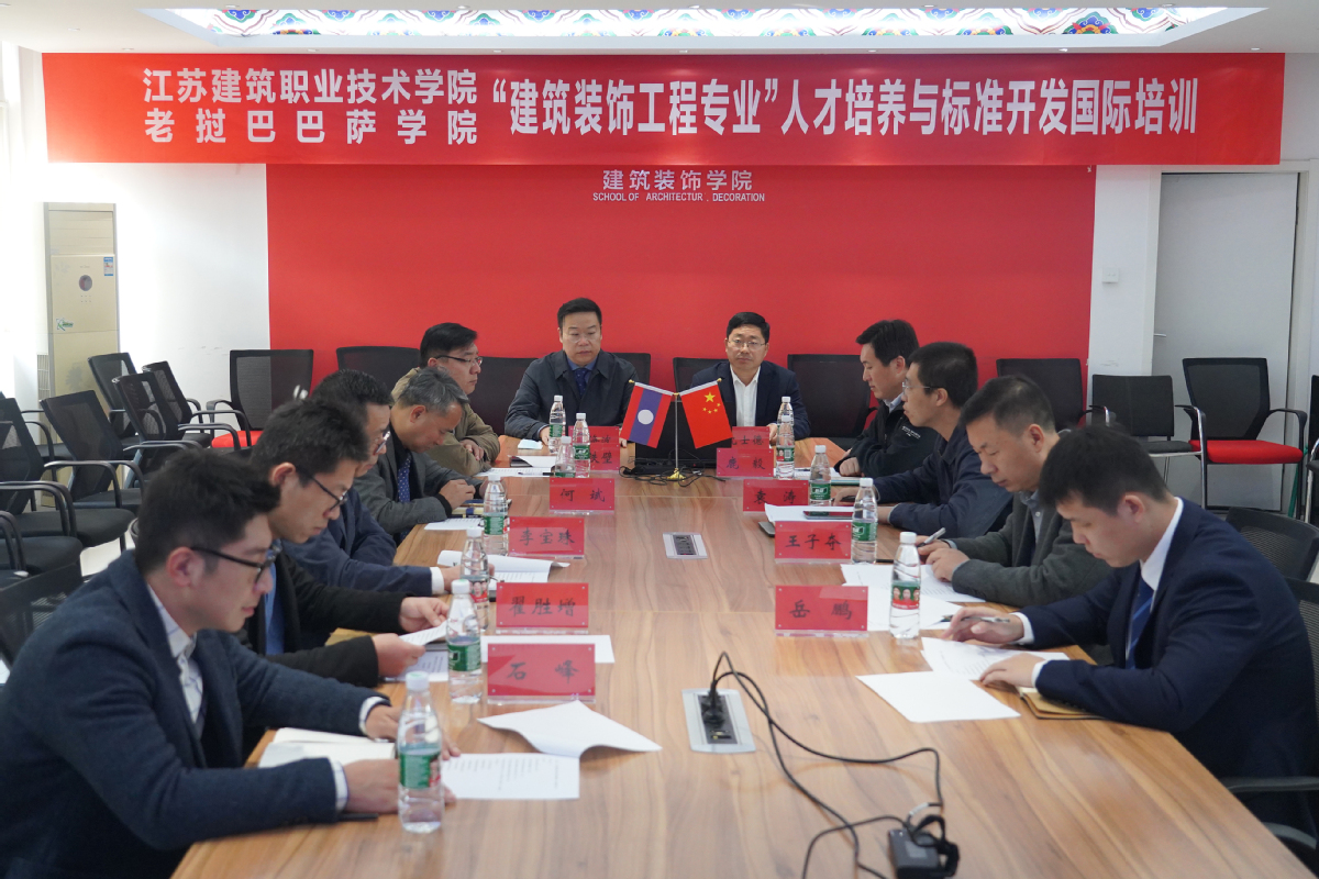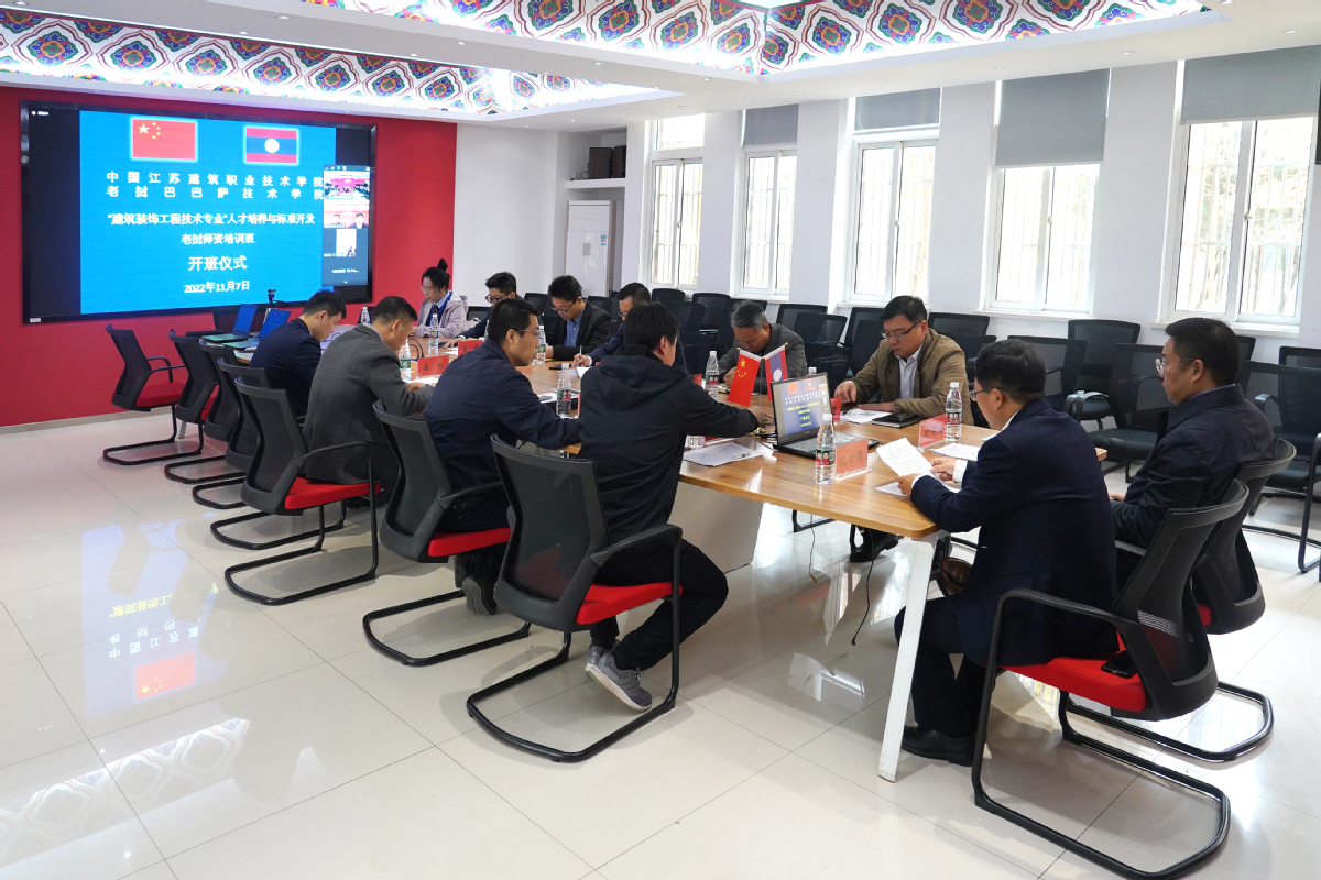 为进一步提升我校“双高专业群”国际化建设水平,拓宽专业群优质教学资源和教学标准输出渠道,加快推进中国建筑职业教学品牌国际化进程,11月7日,我校联合老挝巴巴萨学院共同举办的“建筑装饰工程专业”人才培养与标准开发国际培训班正式开班。开班仪式采用视频连线方式进行,我校主会场设在建筑装饰学院会议室。校长沈士德、副校长刘海波、各相关单位负责人、专业群内各专业主任、培训班讲座专家代表等线下出席了开班仪式。老挝方巴巴萨技术学院校长本朋、副校长卡拉空以及8所职业院校的62名建筑装饰专业师生线上参加仪式。开班仪式由刘海波主持。