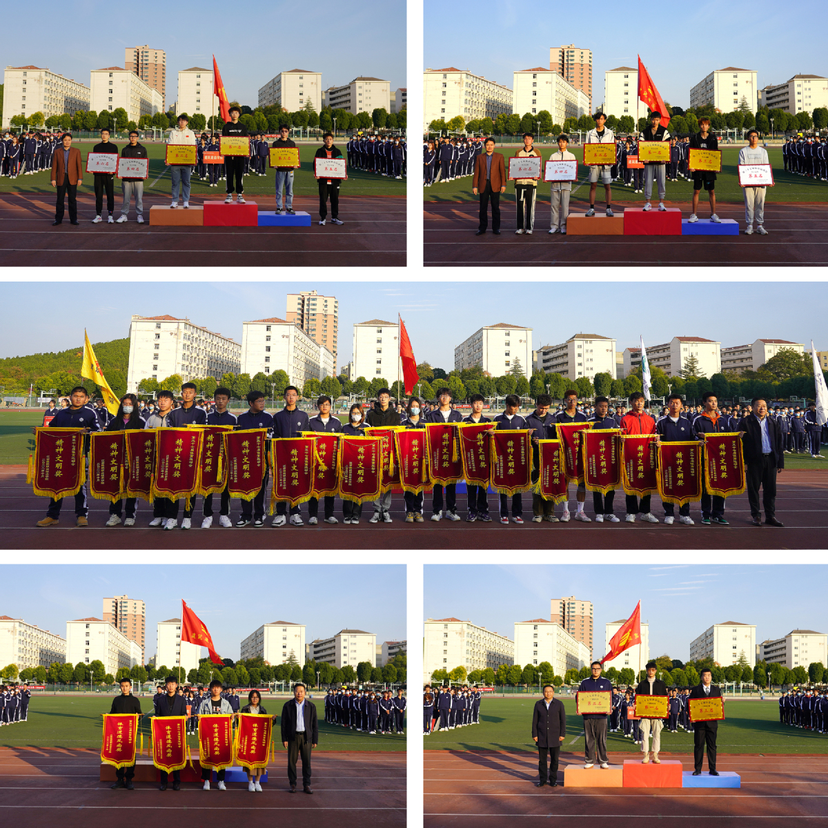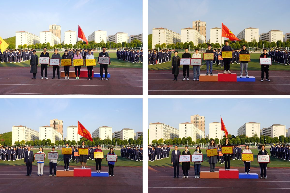 梁惠、鲍桂楠、朱作付、刘海波、蒋兆峰在闭幕式上分别为各组别获奖单位发了奖牌、锦旗。本届运动会共设立58个竞赛项目和趣味项目,参赛运动员达859人。经过激烈角逐,后勤管理服务中心、建筑智能学院、公共基础学院分获教工组总分前三名,建筑装饰学院、信电工程学院、建筑管理学院分获学生组总分前三名,建筑智能学院、建筑装饰学院、建筑建造学院分获学生广播操比赛前三名。信电工程学院、建筑装饰学院、建筑建造学院、智能制造学院获体育道德风尚奖,测量22-1等20个班级获精神文明班级奖。