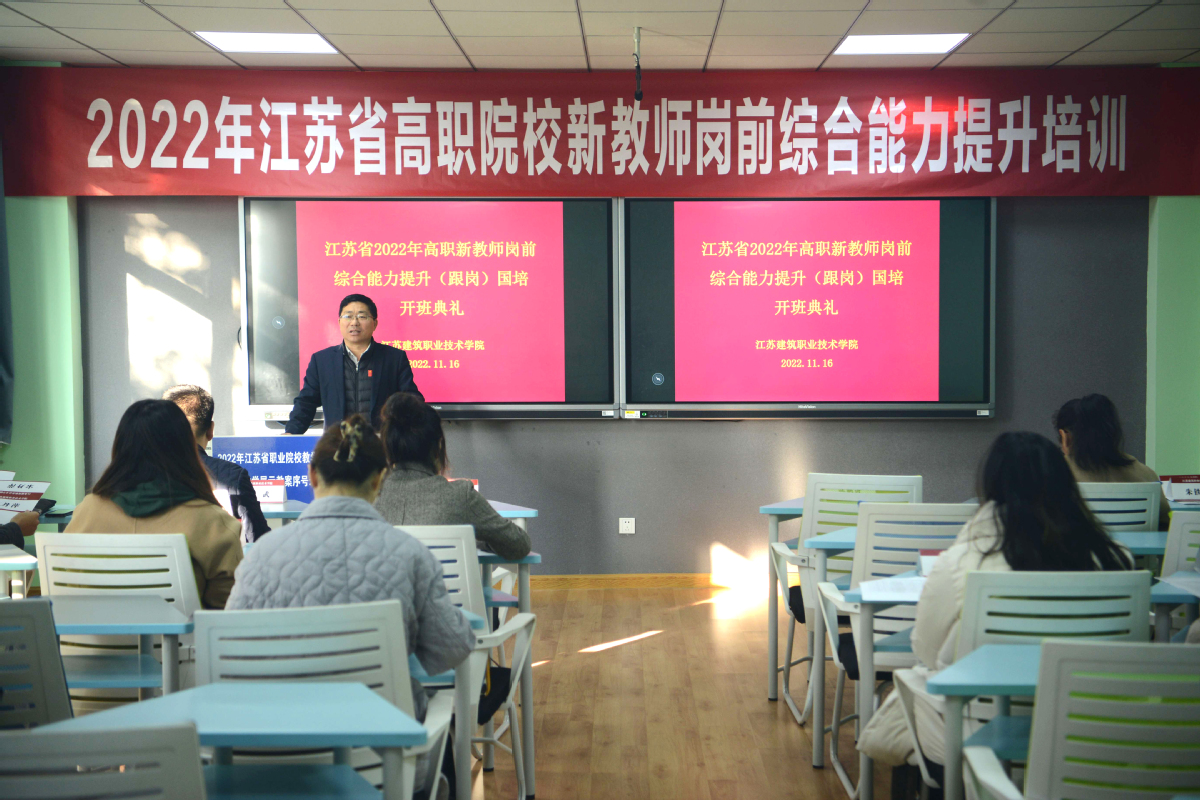 11月16日上午,由江苏省教育厅、省师培中心主办,我校承办的2022年江苏省高职院校新教师岗前综合能力提升培训项目(跟岗实践)国培班开班仪式在我校教一楼举行。校长沈士德出席仪式并致辞,建筑建造学院党政领导班子、省内16所高职院校的20名青年教师学员参加仪式。仪式由建筑建造学院副院长程强强主持。