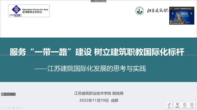 11月19日,由中国高等教育学会指导,欧美同学会留加拿大分会、高校毕业生就业协会、全国工商联民办教育出资者商会、四川师范大学、全球教育50人论坛主办的2022亚洲教育论坛年会在四川成都召开,会议采用线上线下结合、境内境外联线的方式举行,近20个国家和地区的600余位专家学者参会。我校副校长鲍桂楠应邀在线参会,并在大会职业教育高质量发展论坛上作分享发言。