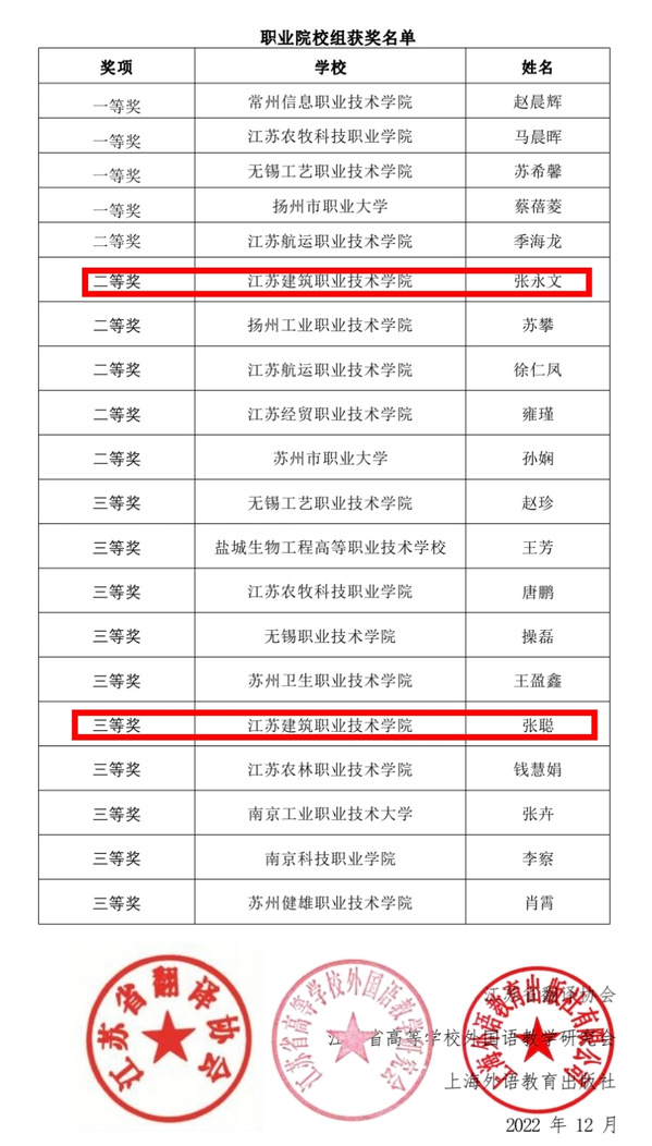 12月4日,第八届“外教社杯”江苏省高校外语教师翻译大赛在南京举行。经过激烈角逐,我校推荐参赛的公共基础学院教师张永文、张聪分获二、三等奖。