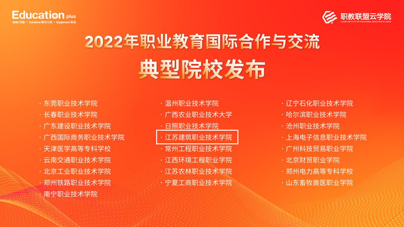12月7日,由德国斯图加特联合展览集团LMS、EducationPlus 国际职业教育大会暨展览会组委会、东莞职业技术学院等单位联合主办的2022 EducationPlus(第六届)国际职业教育大会在线上举行。会上公布了2022年职业教育国际合作与交流典型院校名单,我校成功入选。校长沈士德受邀线上出席活动开幕式,并作题为《江苏建院为“一带一路”国家职教发展供电赋能》的主旨交流发言。