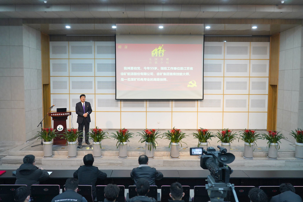 为推动深入学习宣传贯彻党的二十大精神,进一步诠释劳模精神、劳动精神、工匠精神,引领教育广大青年学子积极投身干事创业、技能报国实践,12月8日下午,由徐州市总工会牵头主办的“劳模工匠进校园”活动走进我校。活动邀请到全国劳模、全国五一劳动奖章获得者夏伯党和江苏省劳动模范王行辉故事的讲述人杜建来到现场,为200余名学生代表讲述劳模工匠成长过程。党委副书记梁惠,市工会宣网部副部长李东丽,校党委宣传部、人事处、工会、建筑建造学院、马克思主义学院等单位负责人参加活动。宣讲活动在图书馆报告厅举行。