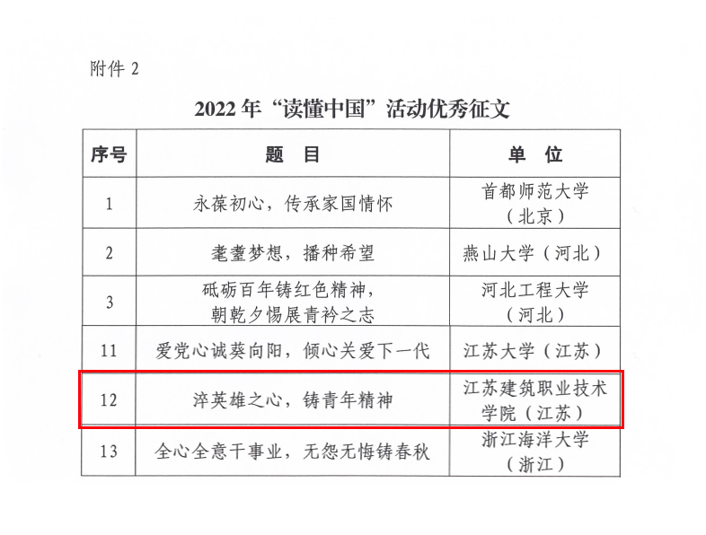 近日,教育部关心下一代工作委员会公布了2022年“读懂中国”活动入选作品名单,我校选送的征文作品《淬英雄之心,铸青年精神》入选“优秀征文”,该作品由教师刘爱萍、程宝珏、刘亚峰指导,装饰21-4班学生胡思羽执笔完成。此外,学校还获评了“活动表扬单位”荣誉称号。