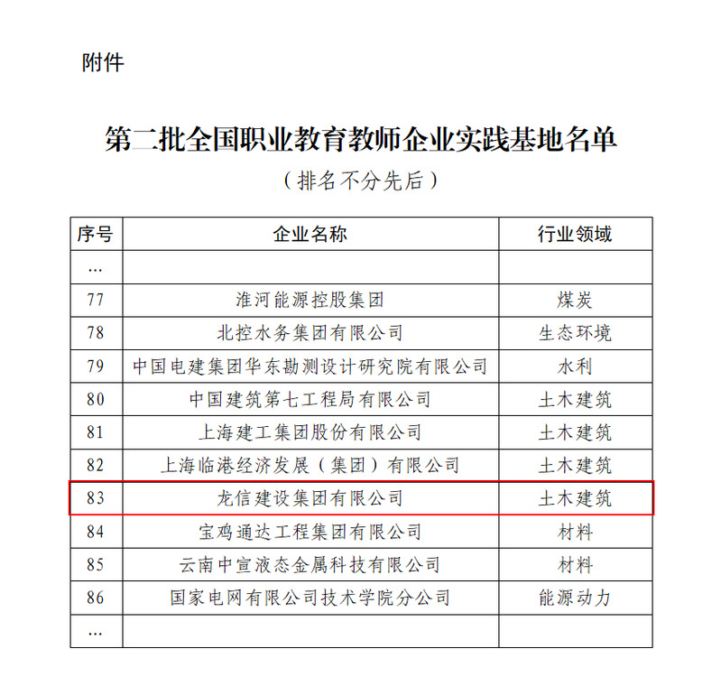 近日,教育部、工业和信息化部、国务院国资委正式公布了第二批全国职业教育教师企业实践基地名单,我校申报的深度校企合作关系企业龙信建设集团有限公司成功入选。本批次全国共100家企业入选名单,其中土木建筑行业领域仅4家。