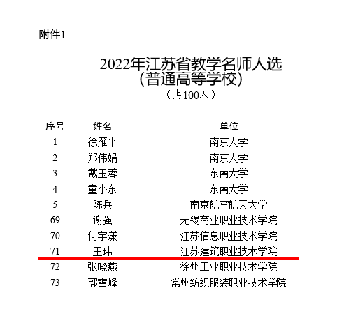 近日,江苏省教育厅公布2022年江苏省教学名师人选名单,我校建筑建造学院教师王玮成功入选。