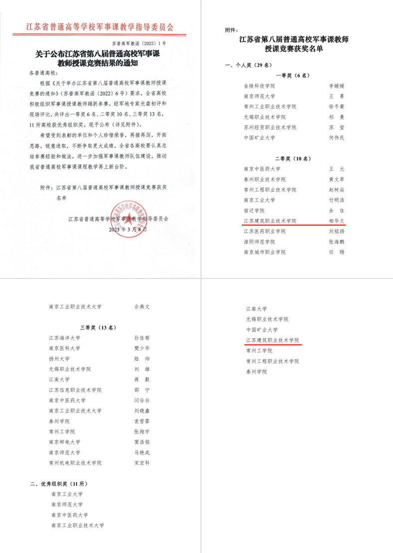 近日,江苏省第八届普通高校军事课教师授课竞赛现场决赛在南京师范大学仙林校区国际学术交流中心落下帷幕。比赛中,由我校推荐参赛的智能制造学院专职辅导员相华文老师发挥出色,最终收获二等奖。学校获评大赛“优秀组织奖”。