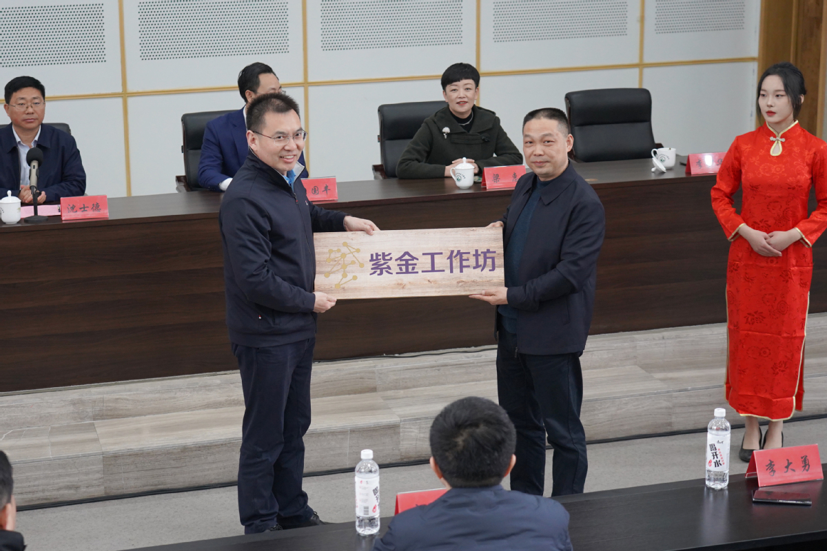 致辞结束后,举行了揭牌仪式与签约仪式。沈士德和王国丰共同为紫金产业学院揭牌,艺术设计学院院长王俭代表产业学院同江苏紫金文创产业发展有限公司签订了合作协议,艺术设计学院党总支书记李大勇代表产业学院受领了“紫金工作坊”牌匾。仪式结束后,视觉20-4班陈心如作为学生代表上台进行了表态发言。