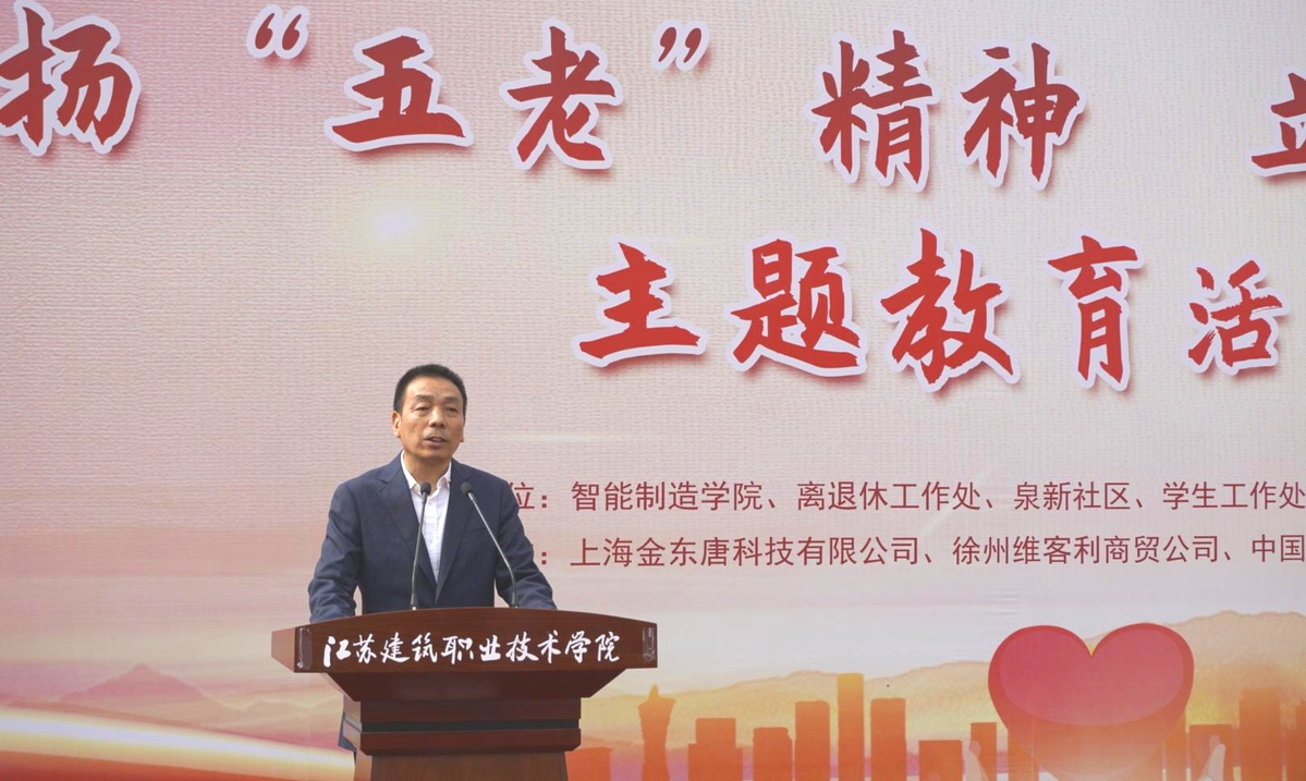 鲍桂楠宣布弘扬‘五老’精神 立志铸魂育人”主题教育活动开幕。宋农村代表徐州市关工委为本次主题教育活动致词,他肯定了我校关工委发挥的优势和作用,期望校地双方同心协力,为新时代青年学生健康成长贡献力量。