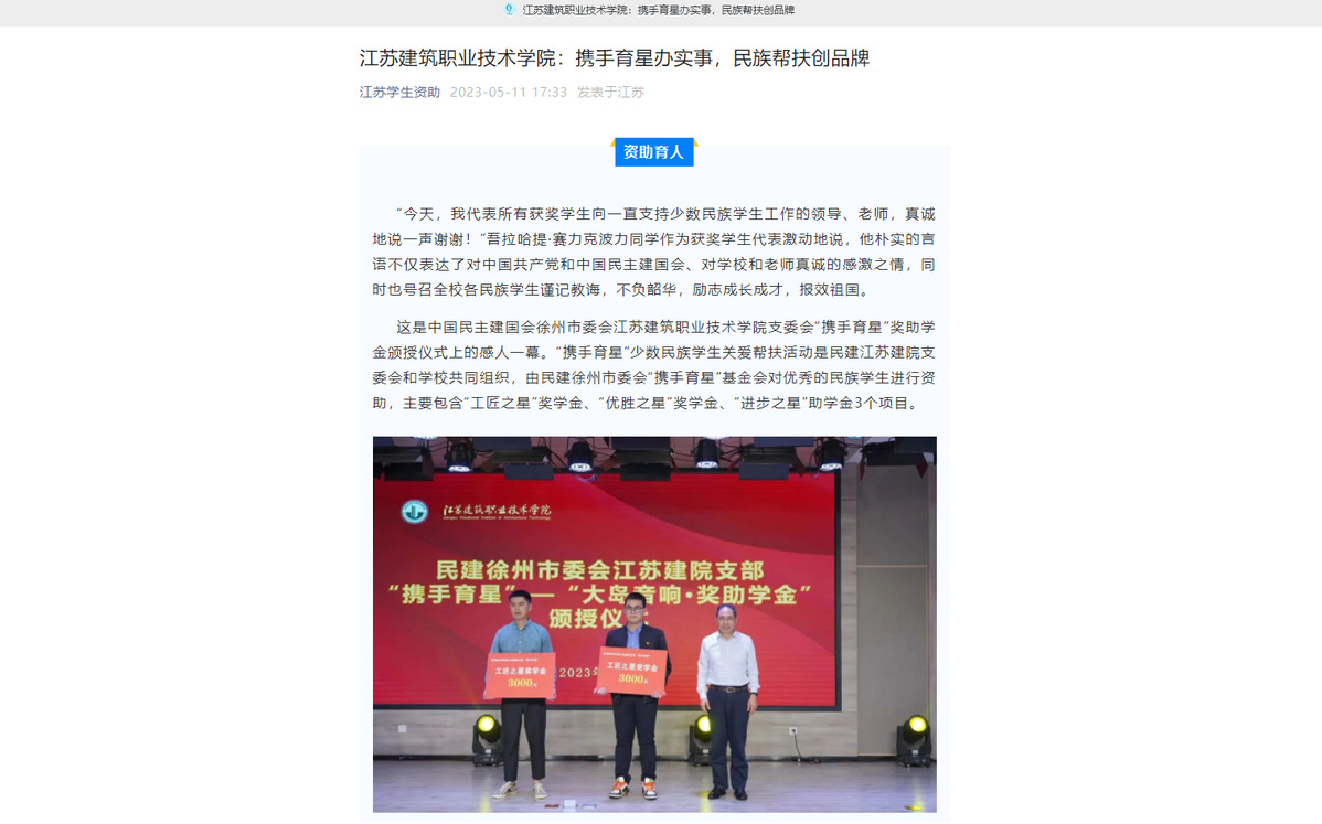 “携手育星”少数民族学生关爱项目是捐资助学、接力希望、凝聚爱心、成就梦想的一件得民心、惠民生的大好事,为学生开启人生梦想、实现人生目标助力,为校园营造弘扬助人为乐、扶贫济困的良好风向抹上浓墨重彩的一笔。目前,民建徐州市委会进一步整合资源,将民建江苏建院支部的少数民族学生关爱工作“携手育星”项目作为民建徐州市委会社会服务创新品牌项目在民建徐州高校支部推广。