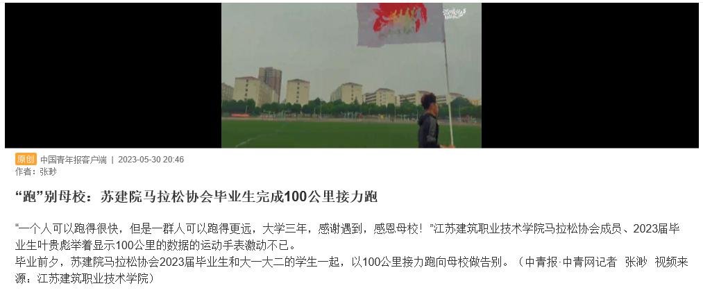 “一个人可以跑得很快,但是一群人可以跑得更远,大学三年,感谢遇到,感恩母校!”华体会体育马拉松协会成员、2023届毕业生叶贵彪举着显示100公里的数据的运动手表激动不已。 毕业前夕,苏建院马拉松协会2023届毕业生和大一大二的学生一起,以100公里接力跑向母校做告别。
