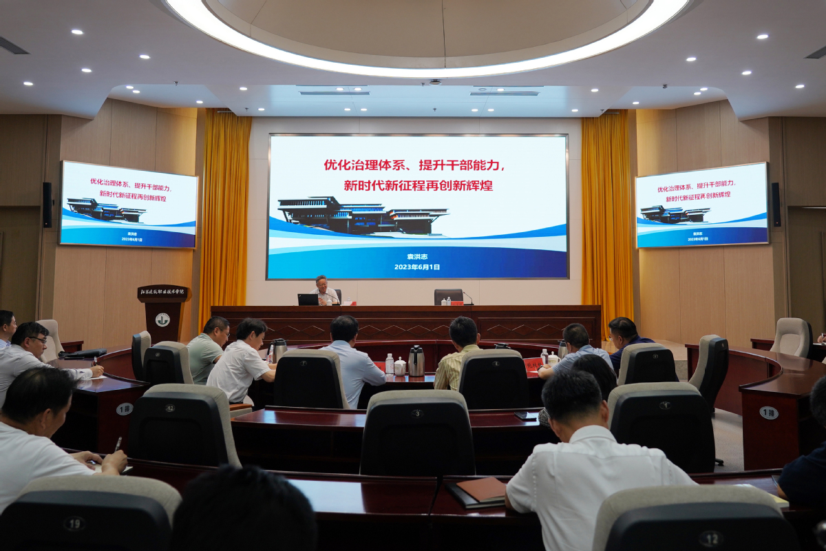 6月1日下午,根据学校党委学习贯彻习近平新时代中国特色社会主义思想主题教育安排,学校在学术报告厅举办干部读书班辅导报告会。学校原党委书记、全国职业院校教学工作诊断与改进专家委员会副主任兼秘书长袁洪志应邀来校,作了题为《优化治理体系、提升干部能力,新时代新征程再创新辉煌》的专题报告。党委书记朱东风,党委副书记、校长沈士德,党委委员、副校长鲍桂楠,党委委员、纪委书记朱作付,党委委员、副校长刘海波,党委委员、副校长蒋兆峰和全体中层干部聆听了报告。报告会由沈士德主持。