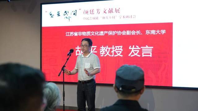 东南大学艺术学院胡平教授在发言中高度赞扬了本次活动的意义和价值,他提到颜廷芳先生创作的反映民间现实的艺术作品,为传统文化艺术的研究与发展提供了宝贵的资料,本次展览是对老一辈传统文化学者的致敬,也是非遗文化连接高校教育的桥梁,对了解地域文化、传承民间艺术、发展中国文化有着重要的意义。