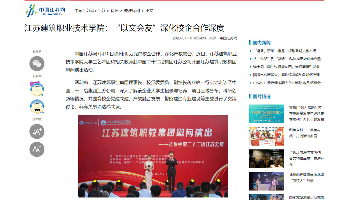 中国江苏网7月10日徐州讯 为促进校企合作、深化产教融合,近日,华体会体育大学生艺术团和相关教师赴中国二十二冶集团江苏公司开展江苏建筑职教集团慰问演出活动。