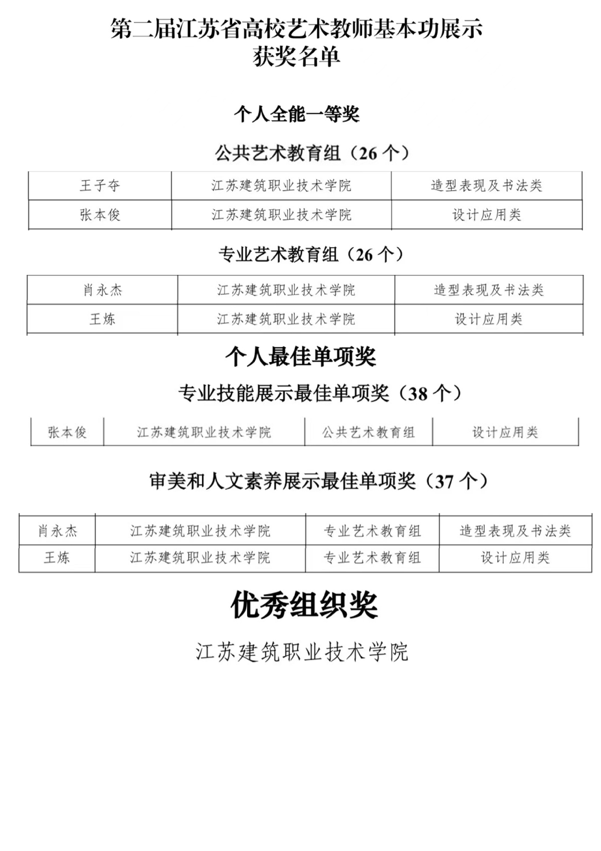 近日,由江苏省教育厅主办的第二届江苏省高校艺术教师基本功展示活动在苏州大学举行,来自全省103所本、专科院校的368位教师同场竞技。我校建筑装饰学院、艺术设计学院的王子夺、王炼、肖永杰、张本俊四位教师参与了公共艺术教育、专业艺术教育两个组别的比赛。经过教学竞赛、专业技能比拼、审美和人文素养展示三轮角逐,四位老师全部获得个人全能一等奖。同时,张本俊获得专业技能最佳单项奖,肖永杰、王炼两位老师获得审美与人文素养最佳单项奖,我校获得优秀组织奖。我校的获奖数量及等次位居全省同类院校第一。
