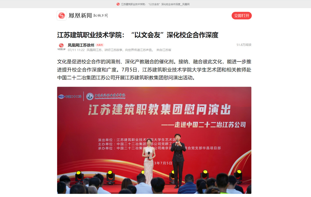 文化是促进校企合作的润滑剂、深化产教融合的催化剂。接纳、融合彼此文化,能进一步推进提升校企合作深度和广度。7月5日,华体会体育大学生艺术团和相关教师赴中国二十二冶集团江苏公司开展江苏建筑职教集团慰问演出活动。