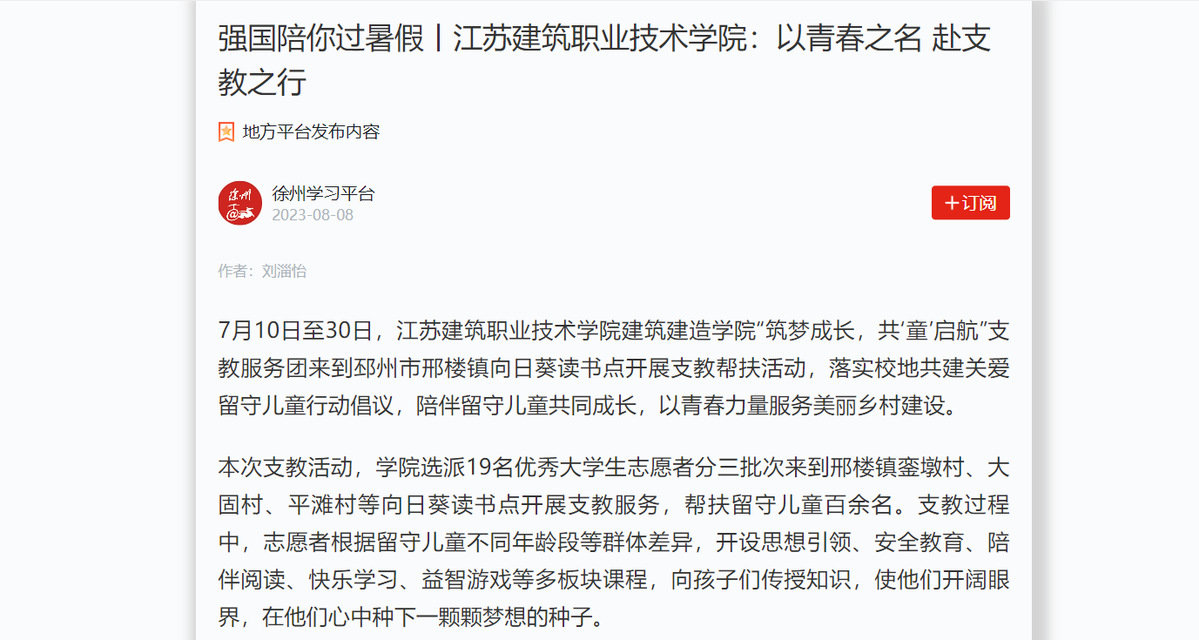 7月10日至30日,华体会体育建筑建造学院“筑梦成长,共‘童’启航”支教服务团来到邳州市邢楼镇向日葵读书点开展支教帮扶活动,落实校地共建关爱留守儿童行动倡议,陪伴留守儿童共同成长,以青春力量服务美丽乡村建设。