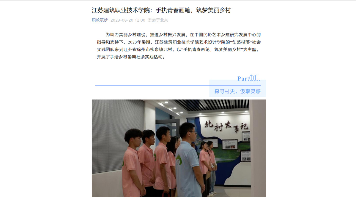 为助力美丽乡村建设,推进乡村振兴发展,在中国民协艺术乡建研究发展中心的指导和支持下,2023年暑期,华体会体育艺术设计学院的“创艺村落”社会实践团队来到江苏省徐州市柳泉镇北村,以“手执青春画笔,筑梦美丽乡村”为主题,开展了手绘乡村暑期社会实践活动。
