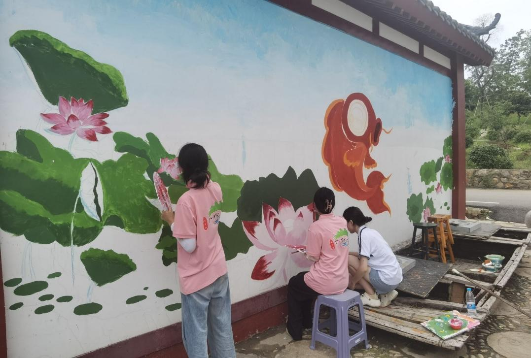 最终,团队成员融合当地乡村的文化特色和自然风光,确定了以“锦鲤荷韵”“农耕秋收”和“田园风光”为创作主题,将用手中的画笔记录这片土地的灵动和美丽。
