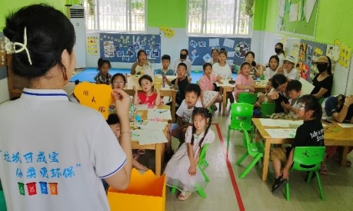 为帮助小朋友了解垃圾对环境的危害,知道如何进行垃圾分类, 从小树立环保意识,7月15日下午,实践团走进沛县张庄镇张楼幼儿园,为小朋友带来一堂生动有趣的垃圾分类宣传课,倡导小朋友主动进行垃圾分类,建设美丽校园。活动现场,实践团首先通过浅显易懂的语言,向小朋友讲解了垃圾分类的意义和方法以及常见垃圾的分类。而后,实践团成员化身垃圾分类考官与小朋友们进行垃圾分类小游戏,引导小朋友将垃圾模型正确投入分类垃圾桶中,小朋友们积极参与,感受垃圾分类的乐趣,增强了垃圾分类意识。最后,实践团引导孩子们化身成垃圾分类小宣传员,用自己的童心妙笔把对垃圾分类、保护美好家园的愿望描绘在纸上,并带给父母,达到以孩子带动家庭,深化家长垃圾分类意识的目的。
