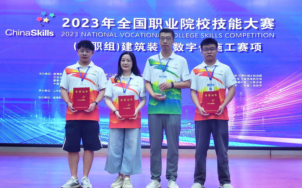 8月14日-17日,2023年全国职业院校技能大赛(高职组)建筑装饰数字化施工赛项在山东省威海职业学院举行,来自全国30个省、自治区、直辖市的59支代表队共计177名选手参加了此次比赛。由建筑装饰学院老师陆文莺、装饰20-1班叶道平、室设20-1班侯小鹏组成的建筑装饰数字化施工赛项参赛队伍作为江苏省代表队之一,获本次国赛一等奖。