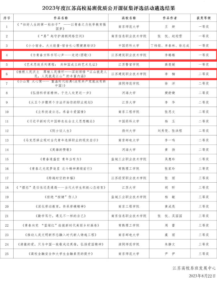近日,在2023年度江苏高校易班优质公开课征集评选活动中,我校智能制造学院教师李璐璐的作品《为青春方阵书写心声——走进〈团歌〉》获得一等奖,艺术设计学院教师李楠的作品《站稳人民立场 植根人民沃土 厚植人民情怀——深刻领悟“江山就是人民,人民就是江山”的丰富内涵》获得二等奖。