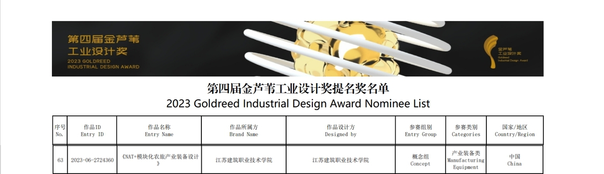 本届大赛历经初评、复评,共126件作品获提名奖(获奖率仅1.9%),其中产业组97件,概念组29件。《NAT+模块化农旅产业装备设计》作为唯一一个高职院校单位作品获奖。