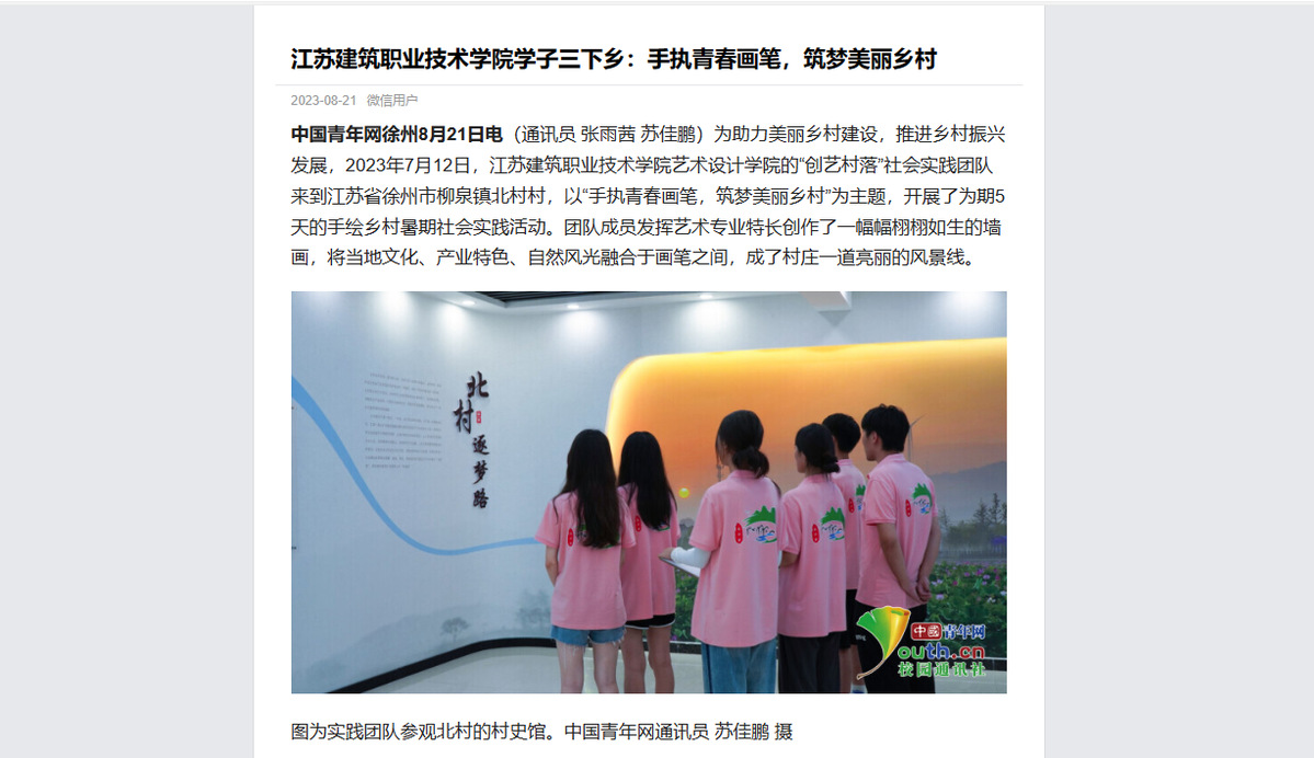 中国青年网徐州8月21日电(通讯员 张雨茜 苏佳鹏)为助力美丽乡村建设,推进乡村振兴发展,2023年7月12日,华体会体育艺术设计学院的“创艺村落”社会实践团队来到江苏省徐州市柳泉镇北村村,以“手执青春画笔,筑梦美丽乡村”为主题,开展了为期5天的手绘乡村暑期社会实践活动。团队成员发挥艺术专业特长创作了一幅幅栩栩如生的墙画,将当地文化、产业特色、自然风光融合于画笔之间,成了村庄一道亮丽的风景线。