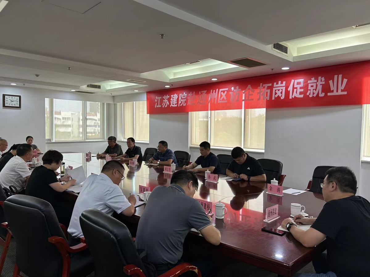 9月7号上午,通州区人社局组织召开了访企拓岗座谈会,通州区人社局局长李锐、副局长何静,人才交流中心主任金烨凌及南通四建、通州建总、通州二建、通州四建、通州建校等单位负责人参加座谈会。座谈会上,李锐对我校赴通州区调研指导表示欢迎,并介绍了通州区的产业布局、“3+2”产业体系和相关人才政策。他希望,通过此次调研交流能够加强与学校在人才招聘、技术服务等方面的合作。随后,蒋兆峰介绍了学校的专业设置、毕业生分布和师资队伍等办学情况,与参会人员就建筑业发展、企业人才需求、建立人才培养基地等问题进行了深入交流。