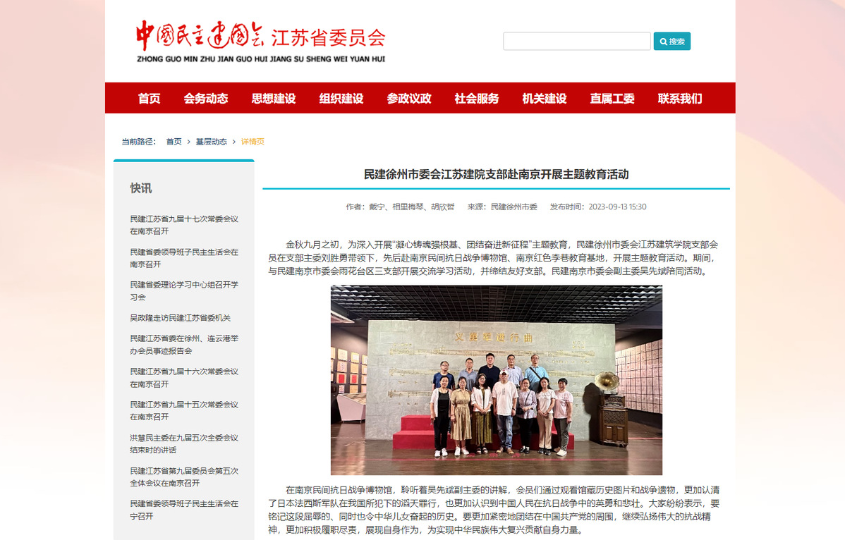 金秋九月之初,为深入开展“凝心铸魂强根基、团结奋进新征程”主题教育,民建徐州市委会江苏建筑学院支部会员在支部主委刘胜勇带领下,先后赴南京民间抗日战争博物馆、南京红色李巷教育基地,开展主题教育活动。期间,与民建南京市委会雨花台区三支部开展交流学习活动,并缔结友好支部。民建南京市委会副主委吴先斌陪同活动。