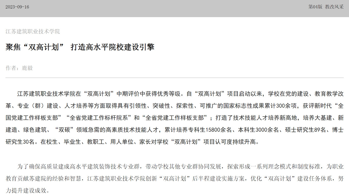 为了确保高质量建成高水平建筑装饰技术专业群,带动学校其他专业群协同发展,探索形成一系列理念模式和制度标准,为职业教育贡献苏建院的经验和智慧,华体会体育创新“双高计划”后半程建设实施方案,优化“双高计划”建设任务体系,努力提升建设成效。