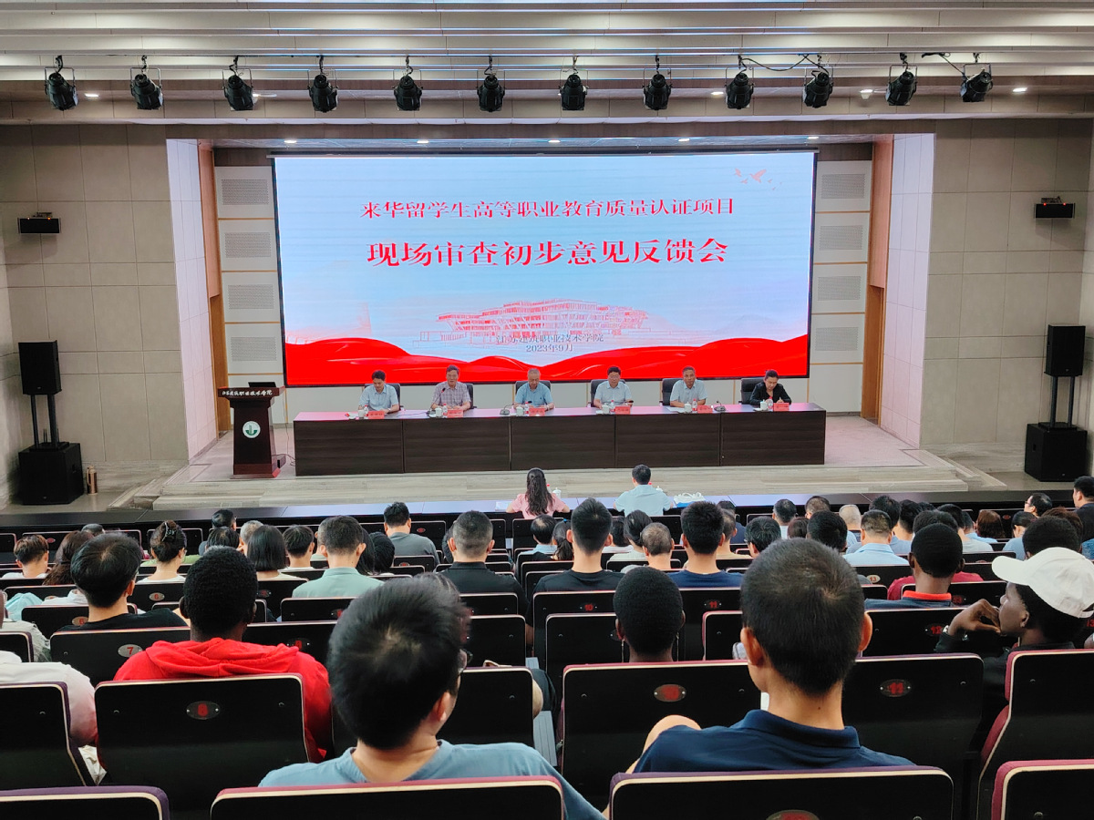 随后,现场审查意见初步反馈会在学校图书馆报告厅召开。专家组根据认证工作现场审查情况,对学校国际化办学特色成果与及存在不足作总结发言。顾建政指出,学校国际化办学处于积极作为,稳步发展阶段,积极响应国家“一带一路”倡议,大力推进海外基地建设,深化“中文+职业技能”实践,开展本土化职业培训,探索出具有一定特色鲜明的国际化办学路径,为服务“走出去企业”、促进职业教育高质量“出海”做出了一定贡献。他对我校来华留学生教育工作提出了五点建议,一是进一步加强顶层设计,挖掘办学潜能;二是进一步完善来华留学教育质量保障体系,提升来华留学教育教学质量水平;三是进一步加强对外招生宣传,优化生源结构;四是强化来华留学归口管理部门与二级学院协同联动,构建来华留学一盘棋工作格局;五是进一步提升来华留学生管理人员和辅导员专业化管理水平。