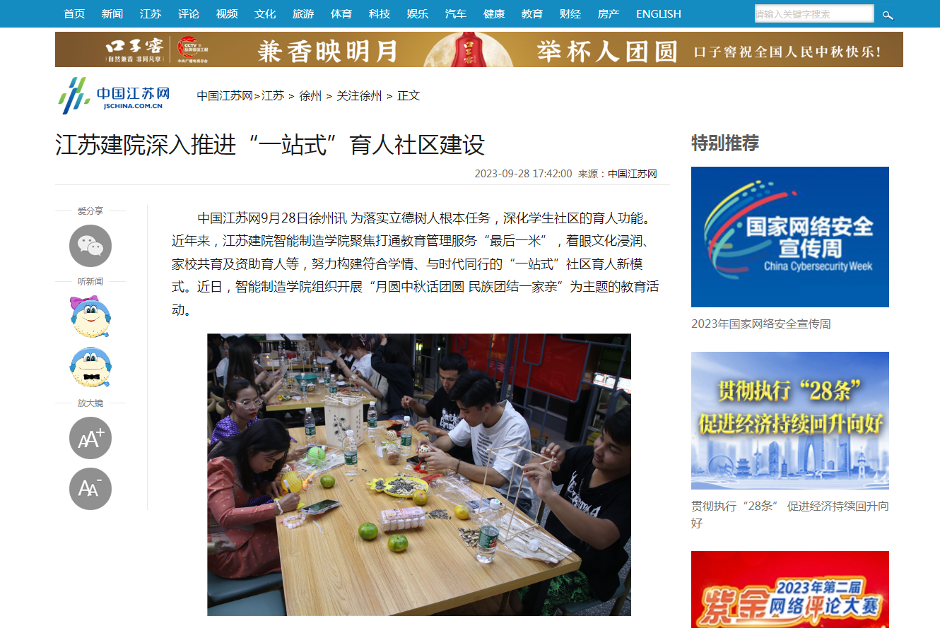 中国江苏网9月28日徐州讯 为落实立德树人根本任务,深化学生社区的育人功能。近年来,江苏建院智能制造学院聚焦打通教育管理服务“最后一米”,着眼文化浸润、家校共育及资助育人等,努力构建符合学情、与时代同行的“一站式”社区育人新模式。近日,智能制造学院组织开展“月圆中秋话团圆 民族团结一家亲”为主题的教育活动。