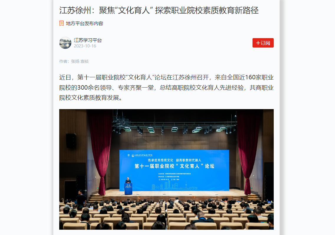 近日,第十一届职业院校“文化育人”论坛在江苏徐州召开,来自全国近160家职业院校的300余名领导、专家齐聚一堂,总结高职院校文化育人先进经验,共商职业院校文化素质教育发展。