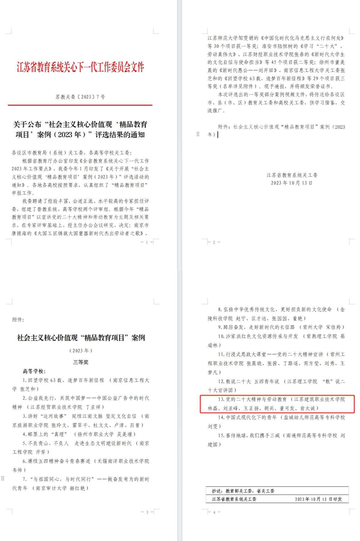 近日,江苏省教育系统关心下一代工作委员会公布“社会主义核心价值观‘精品教育项目’案例(2023年)”评选结果,我校关工委报送的项目《党的二十大精神与劳动教育》获得三等奖。