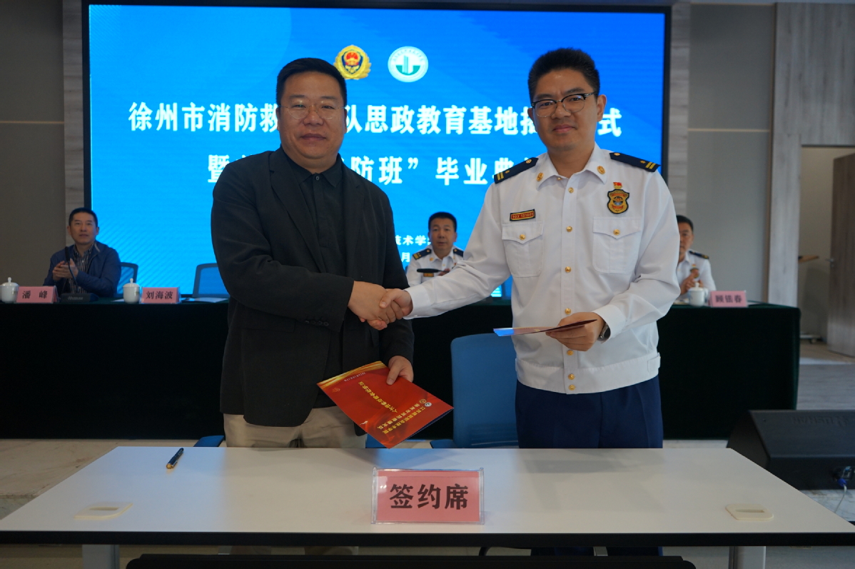 揭牌仪式上,沈士德、张义林共同为徐州市消防救援支队思政教育基地揭牌,刘海波、徐刚签署《深化合作协议》。双方将本着“资源共享、携手共进”的原则,积极拓展“队伍+院校”大思政课育人格局,共同承担起消防员的综合培养工作和全面发展布局,努力把我校打造成支队思政教育的主阵地。