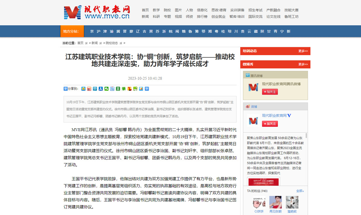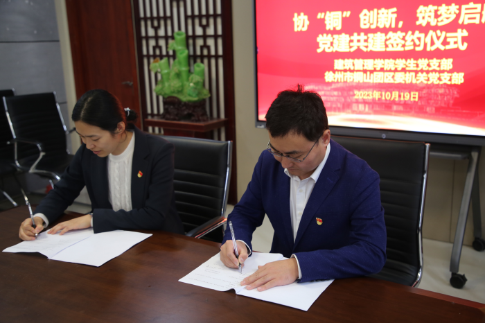 MVE网江苏讯(通讯员 冯郁馨 韩丹丹)为全面贯彻党的二十大精神,扎实开展习近平新时代中国特色社会主义思想主题教育,探索校地党建共建新模式,10月19日下午,华体会体育建筑管理学院学生党支部与徐州市铜山团区委机关党支部开展“协‘铜’创新,筑梦起航”主题党日活动暨党支部共建签约仪式。徐州市铜山团区委书记李治国、副书记刘轩宇、组织部部长张卓然,建筑管理学院党总支书记王国平、副书记冯郁馨、团委书记韩丹丹,以及两个支部的党员共同参加了活动。