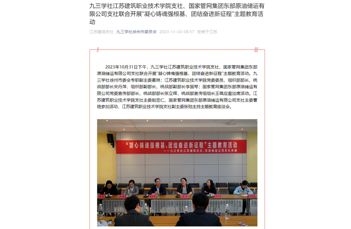 2023年10月31日下午,九三学社华体会体育支社、国家管网集团东部原油储运有限公司支社联合开展“凝心铸魂强根基、团结奋进新征程”主题教育活动。九三学社徐州市委会专职副主委葛琳;华体会体育党委委员、组织部部长、统战部部长宋丹萍,组织部副部长、统战部副部长李国琴;国家管网集团东部原油储运有限公司党委宣传部部长、统战部部长张立辉,统战部宣传组组长王璐应邀出席活动。华体会体育支社主委赵忠仁、国家管网集团东部原油储运有限公司支社主委曹艳参加活动,华体会体育支社副主委张弛主持主题教育座谈会。