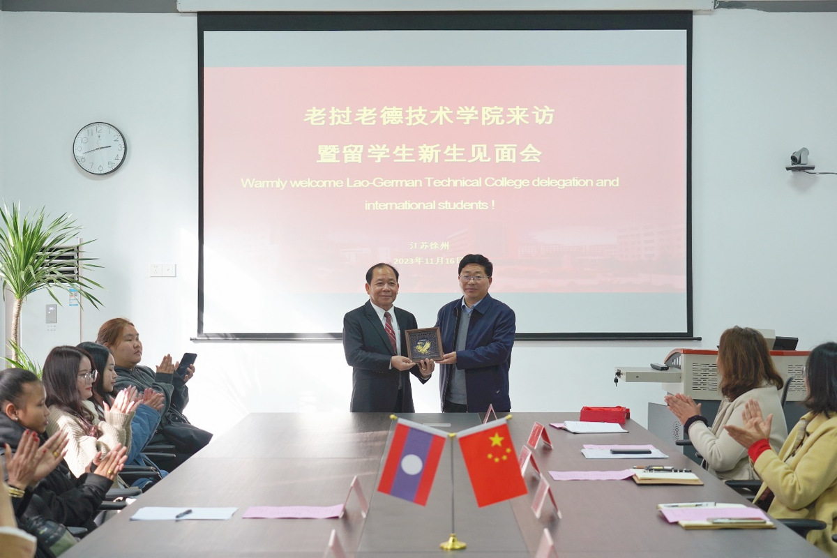 沈士德代表学校对坎萨维的来访表示欢迎,并介绍了学校近期国际化进展,分享了两校互访取得的成果和未来的发展规划。坎萨维赞赏我校在老挝留学生培养方面做出的创新扎实工作,并表示老挝学生回国后都做到了“好就业、就好业”。同时,他感谢我校外派的3批援教教师对老德技术学院专业课程建设和语言文化交流的支持,期待后续我校能在新能源汽车技术及汽车维修等方面开展相应的师资培训和跨国分段人才联合培养工作。