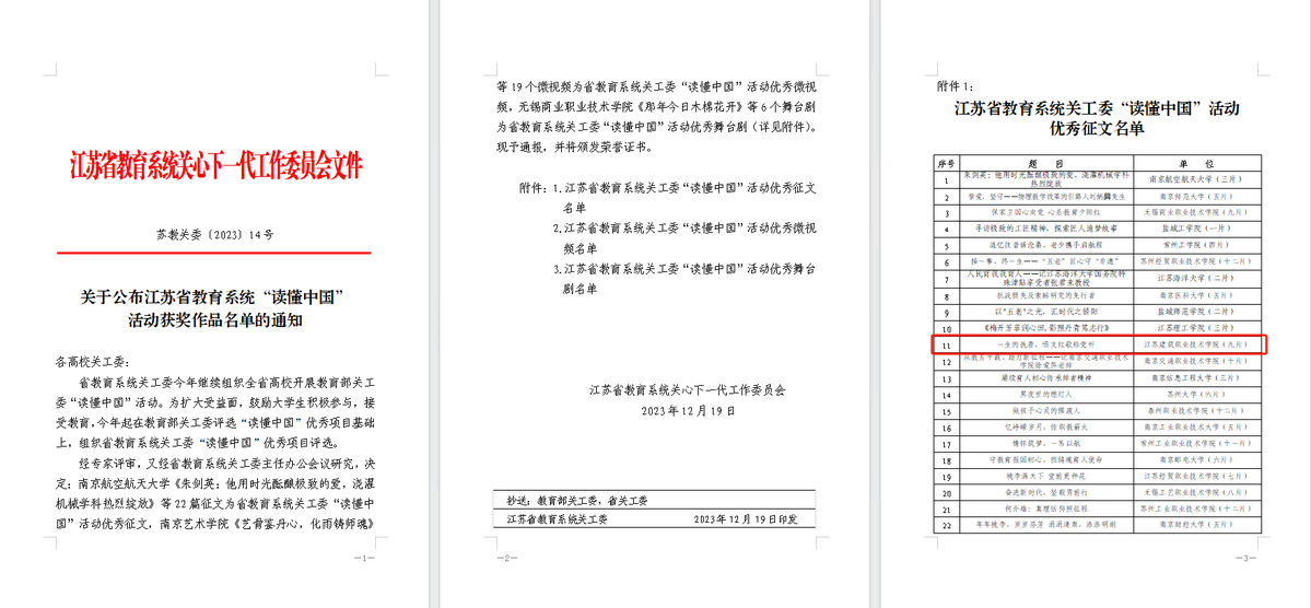 近日,教育部关工委和江苏省教育系统关工委分别公布了2023年“读懂中国”活动获奖名单,我校多个作品获得荣誉。