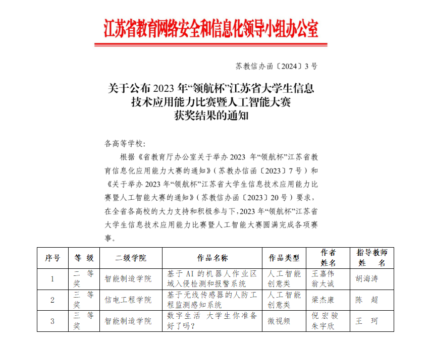 近日,省教育网络安全和信息化领导小组办公室公布了2023年“领航杯”江苏省大学生信息技术应用能力比赛暨人工智能比赛获奖名单,我校获得二等奖1项,三等奖2项。其中人工智能创意类项目《基于AI的机器人作业区域入侵检测和报警系统》(指导教师:胡海涛)获二等奖,人工智能创意类项目《基于无线传感器的人防工程监测感知系统》(指导教师:陈超)和微视频《数字生活,大学生你准备好了吗?》(指导教师:王珂)获三等奖。