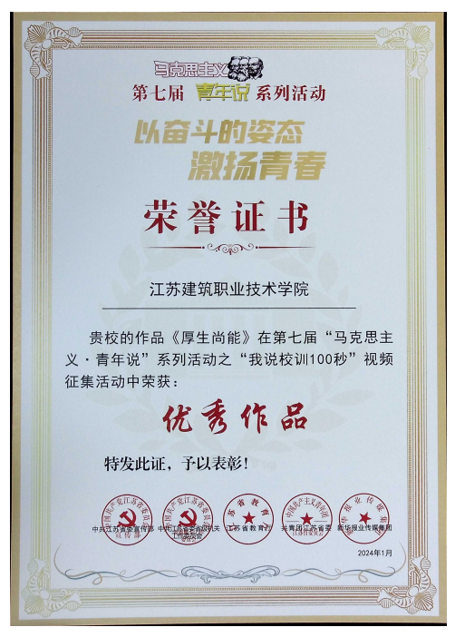 近日,由江苏省委宣传部、省委省级机关工委、省委教育工委、团省委和新华报业传媒集团共同指导开展的第七届“马克思主义·青年说”系列活动顺利落幕。我校视频作品《厚生尚能》获“我说校训100秒”视频征集优秀作品奖(全省10件),摄影作品《光影篮球场》(作者:数媒22-2班苏佳鹏)获“青绘蓝图”创意优秀作品奖(全省50件)。