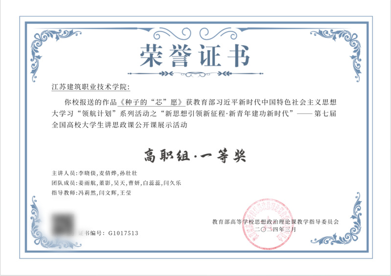 近日,教育部公布了第七届全国高校大学生讲思政课公开课展示活动获奖名单,由李晓倓、麦倩烨、孙壮壮、姜雨航、董影、吴天、曹妍、白蕊蕊、闫久乐学生团队(指导教师:冯莉然、闫文辉、王莹)所创作的作品《种子的“芯”愿》获高职组一等奖,江苏省共有2所高职校获此荣誉。