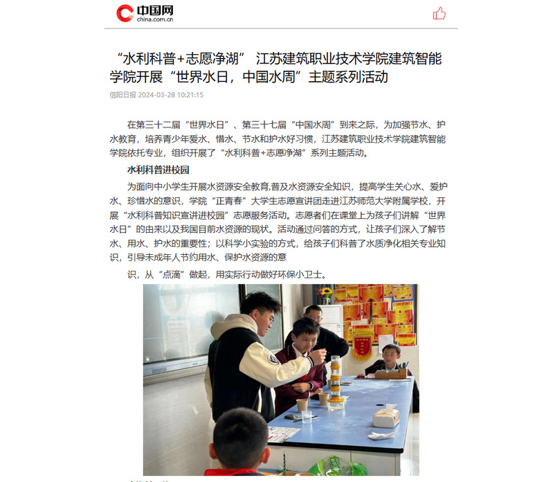 在第三十二届“世界水日”、第三十七届“中国水周”到来之际,为加强节水、护水教育,培养青少年爱水、惜水、节水和护水好习惯,华体会体育建筑智能学院依托专业,组织开展了“水利科普+志愿净湖”系列主题活动。