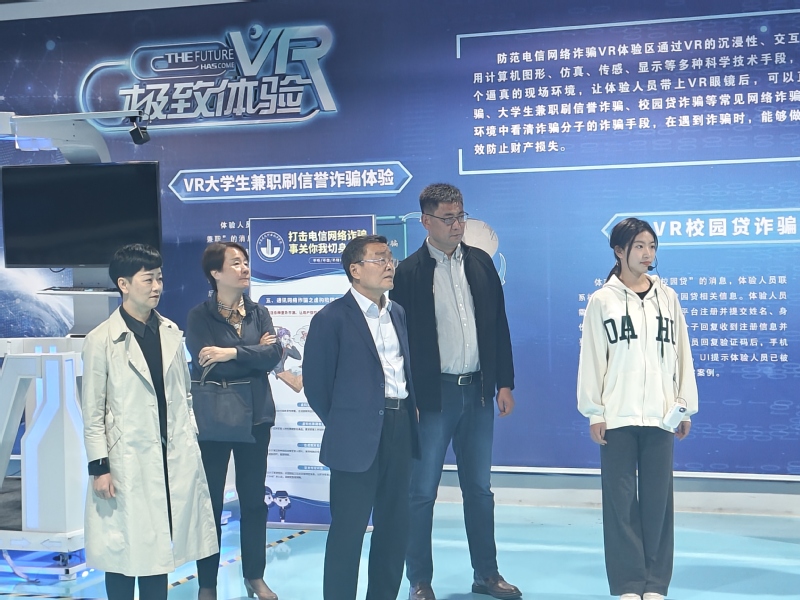 赵兴友一行实地考察了校园防范电信网络诈骗体验中心,详细听取了我校利用体验中心智能化设备开展反诈宣传教育的工作汇报。梁惠表示,近年来,为坚决遏制电信网络诈骗犯罪多发高发态势,全力压降校园诈骗案件数,按照《徐州市人民代表大会常务委员会关于加强预防打击电信网络诈骗工作的决定》要求,我校以安全育人为宗旨,以反诈防骗为重点,通过建设校园防范电信网络诈骗中心,举办反诈专题讲座,利用“互联网+”大学生微课教育平台开展线上安全教育,开展“识诈反诈,共建平安校园”反诈宣传月活动,组织防范电信网络诈骗犯罪宣传周活动,建立校园反诈宣传联盟等方式,全方位、多层次、高密度进行反诈宣传教育,推动反诈宣传融入教育教学、校园生活和家校共育全过程,筑牢校园反诈防线,创建平安无诈校园。